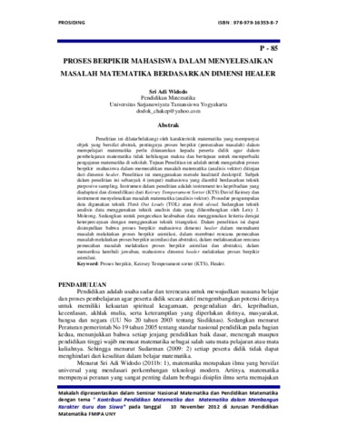 PROSES BERPIKIR MAHASISWA DALAM MENYELESAIKAN MASALAH MATEMATIKA BERDASARKAN DIMENSI HEALER Penelitian ini dilatarbelakangi oleh karakteristik matematika yang mempunyai objek yang bersifat abstrak, pentingnya proses berpikir (pemecahan masalah) dalam mempelajari matematika perlu ditanamkan kepada peserta didik agar dalam pembelajaran matematika tidak kehilangan makna dan bertujuan untuk memperbaiki pengajaran matematika di sekolah. Tujuan Penelitian ini adalah untuk mengetahui proses berpikir mahasiswa dalam memecahkan masalah matematika (analisis vektor) ditinjau dari dimensi healer. Penelitian ini menggunakan metode kualitatif deskriptif. Subjek dalam penelitian ini sebanyak 4 (empat) mahasiswa yang diambil berdasarkan teknik purposive sampling. Instrumen dalam penelitian adalah instrument tes kepribadian yang diadaptasi dan dimodifikasi dari Keirsey Temperament Sorter (KTS) David Keirsey dan instrument menyelesaikan masalah matematika (analisis vektor). Prosedur pengumpulan data digunakan teknik Think Out Louds (TOL) atau think aloud. Sedangkan teknik analisis data menggunakan teknik analisis data yang dikembangkan oleh Lexy J. Moleong. Sedangkan untuk pengecekan keabsahan data menggunakan kriteria derajat keterpercayaan dengan menggunakan teknik triangulasi. Dalam penelitian ini dapat disimpulkan bahwa proses berpikir mahasiswa dimensi healer dalam memahami masalah melakukan proses berpikir asimilasi, dalam membuat rencana pemecahan masalah melakukan proses berpikir asimilasi dan abstraksi, dalam melaksanakan rencana pemecahan masalah melakukan proses berpikir asimilasi dan abstraksi, dalam memeriksa kembali jawaban, mahasiswa dimensi healer melakukan proses berpikir asimilasi. Keyword: Proses berpikir, Keirsey Temperament sorter (KTS), Healer.