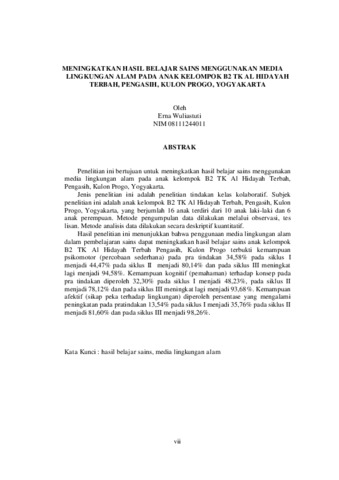 Penelitian ini bertujuan untuk meningkatkan hasil belajar sains menggunakan media lingkungan alam pada anak kelompok B2 TK Al Hidayah Terbah, Pengasih, Kulon Progo, Yogyakarta. Jenis penelitian ini adalah penelitian tindakan kelas kolaboratif. Subjek penelitian ini adalah anak kelompok B2 TK Al Hidayah Terbah, Pengasih, Kulon Progo, Yogyakarta, yang berjumlah 16 anak terdiri dari 10 anak laki-laki dan 6 anak perempuan. Metode pengumpulan data dilakukan melalui observasi, tes lisan. Metode analisis data dilakukan secara deskriptif kuantitatif. Hasil penelitian ini menunjukkan bahwa penggunaan media lingkungan alam dalam pembelajaran sains dapat meningkatkan hasil belajar sains anak kelompok B2 TK Al Hidayah Terbah Pengasih, Kulon Progo terbukti kemampuan psikomotor (percobaan sederhana) pada pra tindakan 34,58% pada siklus I menjadi 44,47% pada siklus II menjadi 80,14% dan pada siklus III meningkat lagi menjadi 94,58%. Kemampuan kognitif (pemahaman) terhadap konsep pada pra tindakan diperoleh 32,30% pada siklus I menjadi 48,23%, pada siklus II menjadi 78,12% dan pada siklus III meningkat lagi menjadi 93,68%. Kemampuan afektif (sikap peka terhadap lingkungan) diperoleh persentase yang mengalami peningkatan pada pratindakan 13,54% pada siklus I menjadi 35,76% pada siklus II menjadi 81,60% dan pada siklus III menjadi 98,26%. Kata Kunci : hasil belajar sains, media lingkungan alam