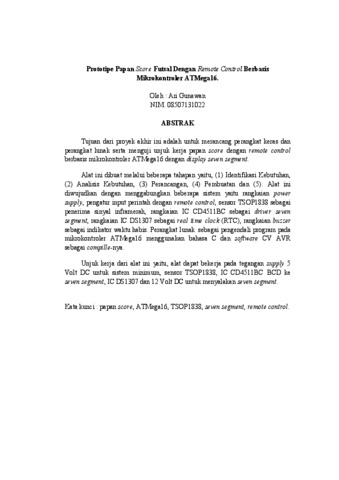 Tujuan dari proyek akhir ini adalah untuk merancang perangkat keras dan perangkat lunak serta menguji unjuk kerja papan score dengan remote control berbasis mikrokontroler ATMega16 dengan display seven segment. Alat ini dibuat melalui beberapa tahapan yaitu, (1) Identifikasi Kebutuhan, (2) Analisis Kebutuhan, (3) Perancangan, (4) Pembuatan dan (5). Alat ini diwujudkan dengan menggabungkan beberapa sistem yaitu rangkaian power supply, pengatur input perintah dengan remote control, sensor TSOP1838 sebagai penerima sinyal inframerah, rangkaian IC CD4511BC sebagai driver seven segment, rangkaian IC DS1307 sebagai real time clock (RTC), rangkaian buzzer sebagai indikator waktu habis. Perangkat lunak sebagai pengendali program pada mikrokontroler ATMega16 menggunakan bahasa C dan software CV AVR sebagai compille-nya. Unjuk kerja dari alat ini yaitu, alat dapat bekerja pada tegangan supply 5 Volt DC untuk sistem minimum, sensor TSOP1838, IC CD4511BC BCD ke seven segment, IC DS1307 dan 12 Volt DC untuk menyalakan seven segment. Kata kunci : papan score, ATMega16, TSOP1838, seven segment, remote control.