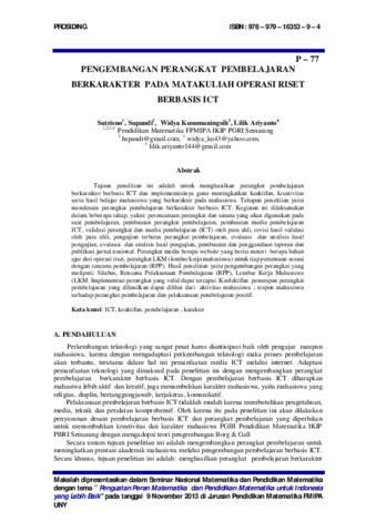 Tujuan penelitian ini adalah untuk menghasilkan perangkat pembelajaran berkarakter berbasis ICT dan implementasinya guna meningkatkan keaktifan, kreativitas serta hasil belajar mahasiswa yang berkarakter pada mahasiswa. Tahapan peneltiian yaitu mendesain perangkat pembelajaran berkarakter berbasis ICT. Kegiatan ini dilaksanakan dalam beberapa tahap, yakni: perencanaan perangkat dan sarana yang akan digunakan pada saat pembelajaran, pembuatan perangkat pembelajaran, pembuatan media pembelajaran ICT, validasi perangkat dan media pembelajaran (ICT) oleh para ahli, revisi hasil validasi oleh para ahli, pengujian terbatas perangkat pembelajaran, evaluasi dan analisis hasil pengujian, evaluasi dan analisis hasil pengujian, pembuatan dan penggandaan laporan dan publikasi jurnal nasional. Perangkat media berupa website yang berisi materi berupa bahan ajar dari operasi riset, perangkat LKM (lembar kerja mahasiswa) untuk tiap pertemuan sesuai dengan rencana pembelajaran (RPP). Hasil penelitian yaitu pengembangan perangkat yang meliputi: Silabus, Rencana Pelaksanaan Pembelajaran (RPP), Lembar Kerja Mahasiswa (LKM. Implementasi perangkat yang valid dapat tercapai. Keefektifan penerapan perangkat pembelajaran yang dihasilkan dapat dilihat dari aktivitas mahasiswa ; respon mahasiswa terhadap perangkat pembelajaran dan pelaksanaan pembelajaran positif. Kata kunci: ICT, keaktifan, pembelajaran , karakter