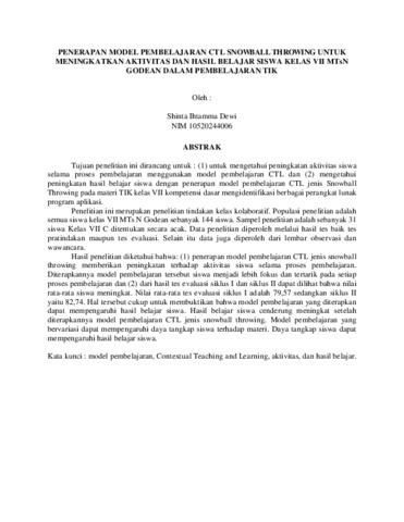 Tujuan penelitian ini dirancang untuk : (1) untuk mengetahui peningkatan aktivitas siswa selama proses pembelajaran menggunakan model pembelajaran CTL dan (2) mengetahui peningkatan hasil belajar siswa dengan penerapan model pembelajaran CTL jenis Snowball Throwing pada materi TIK kelas VII kompetensi dasar mengidentifikasi berbagai perangkat lunak program aplikasi. Penelitian ini merupakan penelitian tindakan kelas kolaboratif. Populasi penelitian adalah semua siswa kelas VII MTs N Godean sebanyak 144 siswa. Sampel penelitian adalah sebanyak 31 siswa Kelas VII C ditentukan secara acak. Data penelitian diperoleh melalui hasil tes baik tes pratindakan maupun tes evaluasi. Selain itu data juga diperoleh dari lembar observasi dan wawancara. Hasil penelitian diketahui bahwa: (1) penerapan model pembelajaran CTL jenis snowball throwing memberikan peningkatan terhadap aktivitas siswa selama proses pembelajaran. Diterapkannya model pembelajaran tersebut siswa menjadi lebih fokus dan tertarik pada setiap proses pembelajaran dan (2) dari hasil tes evaluasi siklus I dan siklus II dapat dilihat bahwa nilai rata-rata siswa meningkat. Nilai rata-rata tes evaluasi siklus I adalah 79,57 sedangkan siklus II yaitu 82,74. Hal tersebut cukup untuk membuktikan bahwa model pembelajaran yang diterapkan dapat mempengaruhi hasil belajar siswa. Hasil belajar siswa cenderung meningkat setelah diterapkannya model pembelajaran CTL jenis snowball throwing. Model pembelajaran yang bervariasi dapat mempengaruhi daya tangkap siswa terhadap materi. Daya tangkap siswa dapat mempengaruhi hasil belajar siswa. Kata kunci : model pembelajaran, Contextual Teaching and Learning, aktivitas, dan hasil belajar.