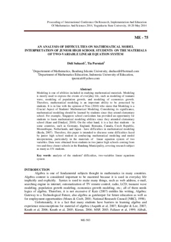 Modeling is one of abilities included in studying mathematical materials. Modeling is mostly used to express the events of everyday life , such as modeling of tsunami wave, modeling of population growth, and modeling of economics growth. Therefore, mathematical modeling is an important ability to be possessed by students. It is in line with the opinion of Niss (2010) who states that Modeling is a Crucial Aspect of Students' Mathematical Modeling. Considering its significance, mathematical modeling should be learned by students since they attend elementary school. For example, Singapore school curriculum has provided an opportunity for students to learn mathematical modeling abilities since they attended elementary school (Kaur and Dindyal, 2010). On the other hand, it is a fact that students - in some countries, such as Germany, England, Romania, Canada, Czech Republic, Mozambique, Netherlands, and Japan - have difficulties in mathematical modeling (Ikeda, 2007). Therefore, this paper is intended to discusse some difficulties faced by junior high school student in conducting mathematical modeling and model interpretation, particularly in the materials of linear equation system of two variables. Data were obtained from students in two junior high schools coming from two and three cluster schools in the Bandung Municipality, covering research subject as many as 151 students.