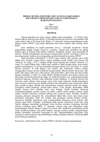 Tujuan penelitian ini secara umum adalah untuk mengetahui : (1) Profil sentra industri tahu di Gunung Saren Kidul, (2) Kondisi internal dan eksternal yang dimiliki oleh sentra indutri tahu di Gunung Saren Kidul, (3) Alternatif strategi pengembangan usaha yang dapat dilakukan oleh sentra industri tahu Gunung Saren Kidul. Jenis penelitian ini adalah penelitian survey dengan pendekatan diskriptif kualitatif. Teknik pengambilan sample dengan Purposive sampling. Sampel dari penelitian ini adalah industri tahu di Gunung Saren Kidul, Trimurti, Srandakan, Bantul, yang berjumlah 28 industri. Teknik pengumpulan data dengan menggunakan metode wawancara, observasi dan dokumentasi. Analisa data menggunkan analisa deskriptif dan analisa SWOT. Hasil penelitian menunjukan 1) Profil sentra industri tahu gunung saren kidul dilihat dari (a)Aspek Tenaga Kerja, tingkat pendikan masih rendah yaitu lulusan SD sebanyak 16 orang ( 57% ). Dengan tenaga kerja keluarga dan pekerja sebanyak 2-5 orang; (b) Aspek Bahan baku, bahan baku mudah di dapat dengan harga yang murah, perhari membutuhkan 25-160 kg kedelai/hari dengan kedelai USA dan lokal. (c) Aspek Metode produksi, di olah dengan cara modern dan tradisional, modern dengan menggunakan tenaga uap dan tradisional dengan jedeng. Macam produk antara lain: tahu putih, tahu magel, tahu sayur, tahu goreng, tahu pong bakso, tahu useng dan tahu kuning dengan ketahanan 2-3 hari. (d) Aspek Modal, Modal bersumber dari modal sendiri atau dari orang tua karena meneruskan usaha. (e) Aspek Pemasaran, cara memasarkan dengan distribusi langsung, Promosi yang dilakukan masih sederhana. 2) Kondisi internal dan eksternal sentra industri tahu gunung saren kidul untuk kekuatan adalah pengalaman turun temurun, upah karyawan rendah, interaksi dan kekerabatan yang cukup kuat, bahan baku mudah di dapat, limbah tahu dimanfaatkan menjadi makanan ternak dan biogas, tersedianya modal pinjaman, tidak ada keluhan dari pelanggan. Kelemahan: SDM rendah, merasa puas terhadap hasil yang didapat, masih memakai teknologi tradisional/sederhana, produk kurang bervariasi, tidak berani melakukan peminjaman modal, pasaran masih sempit. Kondisi Eksternal, meliputi peluang dan ancaman usaha. Peluang; distribusi langsung, pemasok mengantar dan menyediakan bahan baku secara cepat, tepat sesuai permintaan pelanggan, tidak ada keluhan dari pelanggan tentang kualitas produk, banyaknya lembaga pendukung yang memperdulikan kamajuan sentra industri tahu gunung saren kidul. Ancaman : persaingan usaha sejenis, munculnya usaha baru yang sejenis sehingga menambah persaingan, besar kecilnya produksi tergantung hari-hari tertentu, kenaikan harga BBM. 3) Alternatif strategi yang bisa diterapkan untuk pengembangan industri dengan strategi S-O antara lain: menambah modal untuk membeli peralatan yang lebih modern; menjaga kualitas produk; pengembangan produk menembuas konsumen menengah ke atas; memaksimalkan peran lembaga pendukung; menjaga forum dialog dn pembelajaran antar pengrajin. Kata kunci : profil industri tahu, analisis SWOT, alternatif strategi pengembangan.