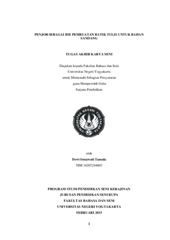 PENJOR SEBAGAI IDE PEMBUATAN BATIK TULIS UNTUK BAHAN SANDANG Oleh Dewi Irmawati Tamala NIM 10207244003 ABSTRAK Tugas Akhir Karya Seni ini bertujuan untuk mendeskripsikan gagasan tentang penerapan bentuk penjor yang dijadikan sebagai ide dasar dalam penciptaan motif batik untuk bahan sandang. Penerapan tersebut lebih menonjolkan bentuk penjor dengan berbagai hiasannya. Keunikan bentuk penjor memunculkan ide dalam penciptaan motif batik tulis untuk bahan sandang. Proses dalam pembuatan karya ini adalah dimulai dari eksplorasi- eksplorasi, studi kepustakaan, kemudian dituangkan ke dalam sket alternatif, sket terpilih dan membuat desain kerja, persiapan bahan dan alat, visualisasi dan praktek secara langsung, tahap visualisasi dilakukan dengan tahapan-tahapan sebagai berikut: pembuatan desain, persiapan bahan dan alat, memindahkan desain dari kertas dengan cara memola di atas kain, mencanting menggunakan malam, membentuk detail karya dengan isen-isen, pencelupan warna, nglorod. Dalam penciptaan Batik ini yang mengambil ide dasar penjor sebagai motif batik untuk bahan sandang, memiliki kegunaan atau fungsi untuk benda pakai sehari- hari, kantor, seragam dan sebagainya. Teknik yang digunakan dalam proses penciptaan karya adalah dengan teknik batik tulis. Bahan yang digunakan sebagai bahan dan alat pokok adalah malam, canthing, 3 macam kain (kain primisima, santung dan katun paris), pewarna naptol, indigosol, remasol, rapit. Adapun hasil karya yang dibuat berjumlah 10 lembar bahan sandang yang terdiri dari 3 kain primisima, 3 kain katun paris dan 4 kain santung, dengan judul batik sebagai berikut: 1) Penjor Gangsing dan Kipas; 2) Penjor Bertatapan; 3) Penjor Gandengan; 4) Penjor Ceplok; 5) Bleketepe Penjor Sido Mukti; 6) Bleketepe Penjor Manten; 7) Bleketepe Penjor Pelangi Ceria; 8) Pure Penjor; 9) Penjor Gerbang Pure; 10) Pure Penjor.