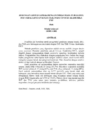 Setiawati, Elinda (2014) HUBUNGAN ASUPAN LEMAK DENGAN INDEKS MASA TUBUH (IMT) DAN TEBAL LIPATAN KULIT (TLK) PADA CIVITAS AKADEMIKA UNY. S1 thesis, UNIVERSITAS NEGERI YOGYAKARTA.