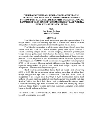 Perdana, Ilya Rosida (2015) PERBEDAAN PEMBELAJARAN IPA MODEL COOPERATIVE LEARNING TIPE SEND A PROBLEM DAN THINK - PAIR - SHARE DITINJAU DARI HASIL BELAJAR KOGNITIF DAN KETERAMPILAN KOOPERATIF PADA MATERI “SISTEM EKSKRESI” BAGI PESERTA DIDIK KELAS VIII SMPN 1 SEWON. S1 thesis, UNY.