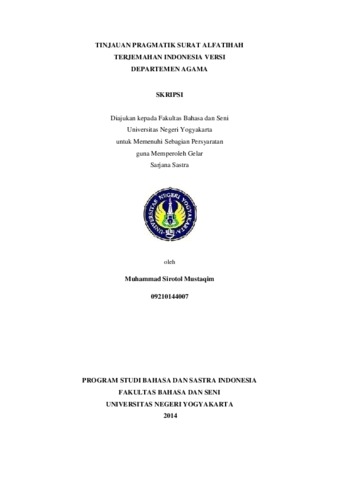 Mustaqim, Muhammad Sirotol (2014) TINJAUAN PRAGMATIK SURAT ALFATIHAH TERJEMAHAN INDONESIA VERSI DEPARTEMEN AGAMA. S1 thesis, Universitas Negeri Yogyakarta.