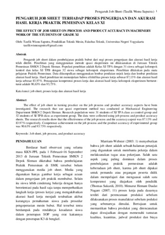 Taufik Wisnu, Saputra THE EFFECT OF JOB SHEET ON PROCESS AND PRODUCT ACCURACY IN MACHINERY WORK OF THE STUDENTS OF GRADE XI. E-Jurnal Pendidikan Teknik Mesin, 2 (3).