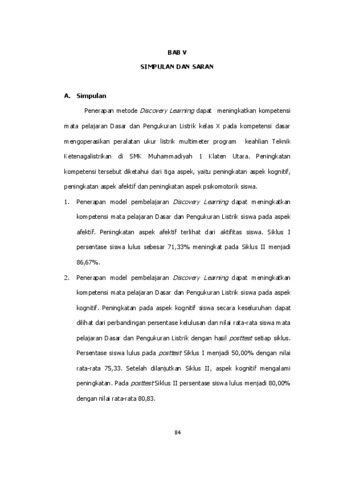 Penelitian ini bertujuan untukmeningkatkan kompetensi siswa kelas X program keahlian Teknik KetenagalistrikanSMK Muhammadiyah 1 Klaten Utara pada Mata Pelajaran Dasar dan Pengukuran Listrik dengan metode Discovery Learning. Penelitian ini merupakan penelitian tindakan kelas. Penelitian tindakan kelas adalah penelitian yang bersiklus. Jumlah pertemuan setiap siklus sebanyak tiga kali. Setiap siklus terdiri dari empat tahap yaitu, perencanaan, tindakan, observasi, dan refleksi. Pengumpulan data menggunakan lembar observasi aktivitas siswa untuk mengetahui peningkatan aspek afektif siswa, lembar kerja siswa untuk mengetahui peningkatan aspek psikomotorik siswa, dan instrumen pretestposttest mengetahui peningkatan aspek kognitif siswa. Analisis data yang digunakan adalah dengan deskriptif kualitatif. Kriteria keberhasilan yang ditetapkan untuk masing-masing indikator pengamatan aktivitas siswa adalah 75% siswa dinyatakan lulus dan nilai rata-rata kelas memperoleh minimal 76. Hasil penelitian diketahui bahwa: (1) penerapanmetode pembelajaran Discovery Learningdapat meningkatkan kemampuan aspek afektif siswa. Siklus I persentase siswa lulus sebesar 71,50%, meningkat pada Siklus II menjadi 86,67%,(2) penerapan metode pembelajaran Discovery Learningdapat meningkatkan kemampuanaspek kognitifsiswa. Persentase siswa lulus posttest Siklus I sebesar 50,00% dengan nilai rata-rata 75,33, setelah dilanjutkan Siklus II, aspek kognitif mengalami peningkatan. Pada posttest Siklus II persentase siswa lulus menjadi 80,00% dengan nilai rata-rata 80,83, (3) penerapanmetode pembelajaran Discovery Learning dapat meningkatkan kemampuan aspek psikomotoriksiswa. Persentasesiswa lulus Siklus I sebesar 33,33% dengannilai rata-rata sebesar 74,14meningkat pada Siklus II menjadi 100% dengan nilai rata-rata 85,83. Kata kunci: kompetensi,dasar dan pengukuran listrik,discovery learning, penelitian tindakan kelas