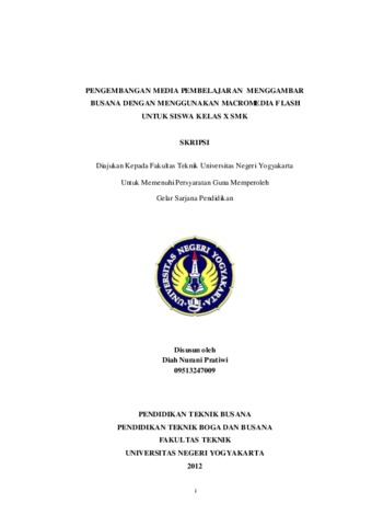 PENGEMBANGAN MEDIA PEMBELAJARAN MENGGAMBAR BUSANA DENGAN MENGGUNAKAN MACROMEDIA FLASH UNTUK SISWA KELAS X SMK Oleh DIAH NURANI PRATIWI 09513247009 ABSTRAK Penelitian ini bertujuan untuk: 1) mengetahui prosedur pengembangan media pembelajaran menggambar busana yang siap diimplementasikan; 2) mengetahui kelayakan penggunaan media pembelajaran menggambar busana sebagai media pembelajaran dikelas; 3) mengetahui respon siswa setelah menggunakan media pembelajaran menggambar busana melalui hasil uji coba. Penelitian ini merupakan penelitian Research and Development (R&D) dengan prosedur penyusunan yang mengadaptasi model Borg and Gall dan William W. Lee & Diana L. Owen. Tahapan-tahapan dari penelitian ini meliputi tahap analisis kebutuhan, tahap perencanaan, tahap pengembangan, tahap uji coba lapangan dan diseminasi terbatas. Penelitian ini melibatkan 1 ahli materi, 1 ahli media, 5 guru SMK Tata Busana, dan 33 siswa SMK Negeri 1 Pringapus. Instrumen yang digunakan dalam penelitian ini berupa angket. Teknik analisis data yang dilakukan adalah analisis deskriptif data berupa uraian saran dari para ahli serta data hasil penilaian yang kemudian diubah menjadi nilai skor dengan skala Likert. Hasil penelitian ini mengungkap bahwa 1) prosedur pengembangan media pembelajaran menggambar busana menggunakan 5 tahap pengembangan; 2) media pembelajaran ini layak untuk digunakan dalam pembelajaran menggambar busana dengan kriteria sangat baik ditinjau dari aspek pembelajaran, kebenaran isi, tampilan pemrograman, penyajian materi dan karakter. Hasil peninjauan dan penilaian dari ahli media (skor 4,201), ahli materi (skor 4,6), guru (skor 4,360); 3) pendapat peserta didik tentang media pembelajaran menggambar busana menunjukkan bahwa pada kriteria baik dengan rerata skor 4,07. Kata kunci: Pengembangan, Media pembelajaran, Menggambar Busana
