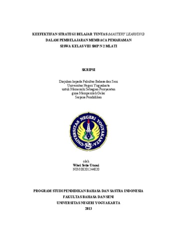 Utami, Wiwi Setio (2013) KEEFEKTIFAN STRATEGI BELAJAR TUNTAS (MASTERY LEARNING) DALAM PEMBELAJARAN MEMBACA PEMAHAMAN SISWA KELAS VIII SMP N 2 MLATI. S1 thesis, Universitas Negeri Yogyakarta.