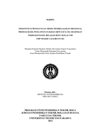 ABSTRAK EFEKTIVITAS PENGGUNAAN MEDIA PEMBELAJARAN MENGENAL PRODUK HASIL PENGAWETAN BAHAN HEWANI YANG DIASINKAN TERHADAP HASIL BELAJAR SISWA KELAS VIII SMP NEGERI 1 KALIBAWANG Oleh: Oktivita Putri Rohmana 08511244012 Penelitian ini bertujuan untuk mengetahui:1)Mengetahui pengembangan Media Pembelajaran Mengenal Produk Hasil Pengawetan Bahan Hewani yang Diasinkan Berbasis Presentasi Adobe Flash yang layak untuk diimplementasikan sebagai media pembelajaran pada materi pengawetan makanan hewani dengan teknik diasinkan di SMP Negeri 1 Kalibawang 2)Mengetahui tingkat kelayakan Media Pembelajaran Mengenal Produk Hasil Pengawetan Bahan Hewani yang Diasinkan Berbasis Presentasi Adobe Flash, 3)Mengetahui hasil belajar kelas kontrol yang menggunakan media pembelajaran hand out , 4) Mengetahui hasil belajar kelas eksperimen yang menggunakan Media Pembelajaran Mengenal Produk Hasil Pengawetan Bahan Hewani yang Diasinkan Berbasis Presentasi Adobe Flash,5) Mengetahui perbedaan hasil belajar antara siswa kelas VIII yang menggunakan media dan tidak menggunakan Berbasis Presentasi Adobe Flash pada Mata Pelajaran PKK SMP Negeri 1 Kalibawang. Metode penelitian ini menggunakan Research and Development. Pengambilan sampel dengan cara teknik probability sampling, berupa random sampling dengan jumlah sampel sebanyak 24 peserta didik (12 siswa Kelas Kontrol dan 12 siswa Kelas Eksperimen). Metode pengumpulan data yaitu angket dan test. Uji validitas instrumen tes dan angket menggunakan validitas kontruksi (contruct validity) dan validitas isi (content validity), dan reliabilitas instrumen menggunakan Metode Belah Dua (Split Half Method) untuk soal tes sebesar (Soal Pretest 0,947 dan Soal Posttest 0,935) , dan angket sebesar 0,984. Uji normalitas menggunakan rumus Chi-Kuadrat (x2) dengan nilai (Soal Pretest 5,44 dan Soal 10) pada kelas eksperimen dan nilai (Soal Pretest 0,75 dan Soal Posttest 3) pada kelas kontrol. Uji homogenitasnya menggunakan uji F diperoleh (Kelas Eksperimen sebesar 1,17 dan Kelas Kontrol sebesar 1,34). Untuk analisis data menggunakan uji t (ttest). Hasil penelitian menunjukkan bahwa : 1) Pengembangan Media Pembelajaran Mengenal Produk Hasil Pengawetan Bahan Hewani yang Diasinkan melalui beberapa tahap antara lain: menganalisis kebutuhan media, menganalisis kebutuhan produk, memvalidasi media pembelajaran, 2) Berdasarkan hasil penilaian dari peserta didik kelas VIII SMP Negeri 1 Kalibawang yang meliputi aspek materi, manfaat dan tampilan media menunjukkan bahwa Media Pembelajaran Mengenal Produk Hasil Pengawetan Bahan Hewani yang Diasinkan ini layak dan sesuai untuk digunakan sebagai sumber belajar bagi guru dan peserta didik di SMP Negeri 1 Kalibawang, 3) Hasil belajar kelas kontrol yang menggunakan media pembelajaran hand out (soal pretest mempunyai rerata sebesar 60,83 dan soal posttest dengan rerata sebesar 82,08), 4) Hasil belajar kelas eksperimen yang Media Pembelajaran Mengenal Produk Hasil Pengawetan Bahan Hewani yang Diasinkan (soal pretest mempunyai rerata sebesar 65,42 dan soal posttest dengan rerata sebesar 82,08), 5) Terdapat perbedaan hasil belajar yang signifikan antara nilai posttest kelas kontrol dan kelas eksperimen, dengan kata lain hasil belajar siswa yang menggunakan Media Pembelajaran Mengenal Produk Hasil Pengawetan Bahan Hewani yang Diasinkan memiliki hasil belajar yang lebih tinggi dibandingkan hasil belajar siswa yang menggunakan metode konvensional berbantukan media pembelajaran hand out.