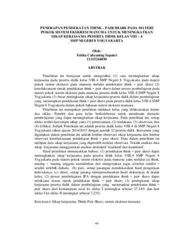 Saputri, Fetika Cahyaning (2015) PENERAPAN PENDEKATAN THINK – PAIR SHARE PADA MATERI POKOK SISTEM EKSKRESI MANUSIA UNTUK MENINGKATKAN SIKAP KERJASAMA PESERTA DIDIK KELAS VIII – 4 SMP NEGERI 8 YOGYAKARTA. S1 thesis, FMIPA.