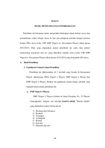 Penelitian ini bertujuan untuk mengetahui: 1) hubungan antara pemanfaatan waktu belajar di luar jam pelajaran dengan prestasi belajar PKn, 2) hubungan antara minat belajar dengan prestasi belajar PKn, 3) hubungan antara pemanfaatan waktu belajar di luar jam pelajaran dan minat belajar secara bersama-sama dengan prestasi belajar PKn siswa kelas VIII SMP Negeri se- Kecamatan Playen tahun ajaran 2013/2014. Penelitian ini merupakan penelitian korelasi dengan menggunakan pendekatan kuantitatif. Populasi dalam penelitian ini adalah siswa kelas VIII SMP Negeri se- Kecamatan Playen Gunungkidul tahun ajaran 2013/2014. Teknik pengambilan sampel menggunakan teknik Stratified random sampling. Sampel dalam penelitian ini adalah SMP Negeri 1 Playen, SMP Negeri 2 Playen dan SMP Negeri 4 Playen yang berjumlah 205 siswa. Uji coba instrumen dilaksanakan kepada 30 siswa kelas VIII SMP Negeri 3 Playen. Metode pengumpulan data menggunakan angket dan tes. Uji coba instrumen menggunakan uji validitas dan uji reabilitas. Sebelum analisis data dilakukan uji prasyarat analisis meliputi uji normalitas, uji linieritas dan uji multikolinieritas. Kemudian pengujian hipotesis menggunakan analisis bivariat dan multivariat. Analisis bivariat dalam penelitian ini menggunakan korelasi product moment untuk menguji hubungan variabel secara parsial, sedangkan analisis multivariat menggunakan regresi berganda untuk menguji hubungan variabel secara bersama-sama. Tingkat signifikansi hasil analisis ditentukan sebesar 5%. Berdasarkan hasil penelitian dapat diperoleh kesimpulan sebagai berikut : 1) Ada hubungan yang positif dan signifikan antara pemanfaatan waktu belajar diluar jam pelajaran dengan prestasi belajar pendidikan kewarganegaraan siswa kelas VIII SMP Negeri se-Kecamatan Playen tahun ajaran 2013/2014 yang ditunjukkan dengan nilai r hitung sebesar 0,487. 2) Ada hubungan yang positif dan signifikan antara minat belajar dengan prestasi belajar pendidikan kewarganegaraan siswa kelas VIII SMP Negeri se-Kecamatan Playen tahun ajaran 2013/2014 yang ditunjukkan dengan nilai r hitung sebesar 0,531. 3) Ada hubungan yang positif dan signifikan antara pemanfaatan waktu belajar diluar jam pelajaran dan minat belajar siswa secara bersama-sama dengan prestasi belajar pendidikan kewarganegaraan siswa kelas VIII SMP Negeri se-Kecamatan Playen tahun ajaran 2013/2014 yang ditunjukkan dengan koefisien korelasi (r) 0,603 dan koefisien determinasi (R 2) sebesar 0,363. Ini berarti 36,3% prestasi belajar PKn dijelaskan oleh pemanfaatan waktu belajar diluar jam pelajaran dan minat belajar. Sedangkan 63,7% dijelaskan oleh faktor lain yang tidak dianalisis dalam penelitian ini. Kata kunci : pemanfaatan waktu belajar di luar jam pelajaran, minat belajar, prestasi belajar