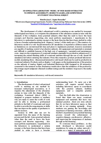 Hendra, Jaya and Sapto, Haryoko (2014) 3D SIMULATION LABORATORY MODEL OF WEB-BASED INTERACTIVE TO IMPROVE ACCESSIBILITY, DESIRE TO LEARN, AND COMPETENCE OF STUDENT VOCATIONAL SUBJECT. International Conference On Vocational Education And Training (ICVET) May 14 th, 2014. ISSN 2301-7147