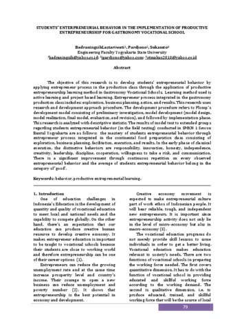 Badraningsih, Lastariwati and Pardjono and Sukamto (2014) STUDENTS’ ENTERPRENEURIAL BEHAVIOR IN THE IMPLEMENTATION OF PRODUCTIVE ENTREPRENEURSHIP FOR GASTRONOMY VOCATIONAL SCHOOL. International Conference On Vocational Education And Training (ICVET) May 14 th, 2014. ISSN 2301-7147