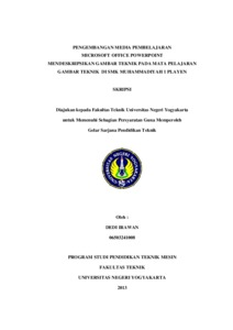 PENGEMBANGAN MEDIA PEMBELAJARAN MICROSOFT OFFICE POWERPOINT MENDESKRIPSIKAN GAMBAR TEKNIK PADA MATA PELAJARAN GAMBAR TEKNIK DI SMK MUHAMMADIYAH 1 PLAYEN Oleh: Dedi Irawan 06503241008 Tujuan penelitian ini adalah untuk mengetahui proses pengembangn media pembelajaran Microsoft Office Powerpoint untuk menunjang proses pembelajaran, serta mengetahui kelayakan produk berupa media pembelajaran Microsoft Office Powerpoint pada mata pelajaran Gambar Teknik, standar kompetensi membaca gambar teknik, kompetensi dasar medeskripsikan gambar teknik. Pengembangan media pembelajaran Microsoft Office Powerpoint ini terdiri dari 4 tahap yaitu: (1) Tahap pendahuluan; (2) Tahap pengembangan produk; (3) Tahap uji coba produk; (4) Tahap distribution yaitu pembuatan master file serta dokumentasi system dalam bentuk CD (compact disk). Teknik analisis data yang digunakan adalah teknik analisis deskriptif kuantitatif yaitu dengan menganalisis data-data kuantitatif hasil uji ahli, uji terbatas dan uji luas. Data kuantitatif yang berupa angka-angka hasil pengukuran dijumlahkan kemudian dibandingkan dengan jumlah yang diharapkan sehingga diperoleh persentase kelayakan. Hasil penelitian kelayakan media pembelajaran Microsoft Office Powerpoint pada mata pelajaran Gambar Teknik, standar kompetensi membaca gambar teknik, kompetensi dasar medeskripsikan gambar teknik adalah: (1) Persentase hasil penilaian ahli materi (Dosen FT UNY) diperoleh 81,94%; (2) Persentase hasil penilaian ahli materi (guru mata pelajaran) diperoleh 86,11%; (3) Persentase hasil penilaian ahli media diperoleh 94,44%; (4) Persentase hasil tanggapan pemakaian terbatas 1 diperoleh 81,05%; (5) Persentase hasil tanggapan pemakaian terbatas 2 diperoleh 77,03%; (6) persentase hasil tanggapan pemakaian lebih luas diperoleh 77,76%. Berdasarkan hasil penilaian para ahli dan tanggapan pemakaian yang diperoleh tersebut maka dapat disimpulkan bahwa media pembelajaran Microsoft Office Powerpoint pada mata pelajaran Gambar Teknik, standar kompetensi membaca gambar teknik, kompetensi dasar medeskripsikan gambar teknik sangat layak untuk digunakan dalam proses pembelajaran. Kata kunci: Media pembelajaran Microsoft Office Powerpoint