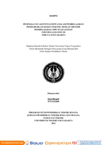 ABSTRAK PENINGKATAN AKTIVITAS SISWA DALAM PEMBELAJARAN PEMELIHARAAN BAHAN TEKSTIL DENGAN METODE PEMBELAJARAN TIPE TEAM ASISTED INDIVIDUALIZATION DI SMK N 6 YOGYAKARTA Oleh : Dewi Riyanti 07513241006 Penelitian ini bertujuan untuk mengetahui 1) Meningkatkan upaya aktivitas dan partisipasi siswa dalam pembelajaran pemeliharaan bahan tekstil di SMK N 6 Yogyakarta melalui pembelajaran kooperatif tipe Team Asisted Individualization, 2) Meningkakan aktivitas dan partisipasi siswa dalam pembelajaran pemeliharaan bahan tekstil di SMK N 6 Yogyakarta melalui pembelajaran kooperatif tipe Team Asisted Individualization (TAI) Penelitian ini adalah penelitian tindakan kelas secara kolaboratif dengan desain penelitian model Kemmis dan Taggart yang dilaksanakan sesuai dengan prosedur penelitian sebagai berikut: Perencanaan-Tindakan-Observasi-Refleksi. Penelitian dilaksanakan di SMK N 6 Yogyakarta dengan subjek penelitian adalah 36 siswa pada kelas X Busana Butik 2. Metode pengumpulan data menggunakan lembar observasi aktivitas siswa dan tes uraian. Uji validitas berdasarkan pendapat dari para ahli (judgement expert), seperti ahli model pembelajaran, ahli materi dan guru mata diklat pemeliharaan bahan tekstil. Hasil validasi menunjukkan bahwa model dan media yang digunakan sudah layak dan instrumen dinyatakan sudah valid. Uji reliabilitas menggunakan rumus alpha cronbach’s. Teknik analisis data yang digunakan dalam adalah analisis deskriptif. Hasil penelitian meliputi tahap perencanaan yang dilakukan oleh peneliti berkolaborasi dengan guru. Tahap tindakan guru melakukan pembelajaran pemeliharaan bahan tekstil menggunakan model cooperative learning tipe TAI, dan pengamatan dilakukan terhadap proses pembelajaran dan aktivitas siswa. Selanjutnya tahap refleksi dilakukan pengamatan dan perbaikan pada siklus sebelumnya, sehingga pembelajaran pemeliharaan bahan tekstil pada siklus berikutnya akan berjalan lebih baik. Peningkatan pencapaian kriteria ketuntasan minimal (KKM) yaitu pra siklus 70.16% (15 siswa) yang sudah memenuhi KKM, pada siklus I pencapaian kompetensi siswa meningkat menjadi 79.51% (31 siswa), dan pada siklus II pencapaian kompetensi siswa 100% (36 siswa) sudah memenuhi KKM. Uraian diatas menunjukkan bahwa penerapan model cooperative learning tipe TAI dapat meningkatkan aktivitas siswa dalam pembelajaran pemeliharaan bahan tekstil. Kata Kunci : Aktivitas Siswa, Pemeliharaan Bahan Tekstil, Metode Pembelajaran Tipe Team Asisted Individualization (TAI)