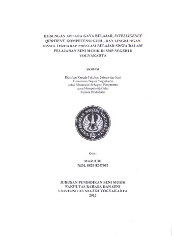 Marjudi (2012) HUBUNGAN ANTARA GAYA BELAJAR, INTELLIGENCE QUOTIENT, KOMPETENSI GURU, DAN LINGKUNGAN SISWA TERHADAP PRESTASI BELAJAR SISWA DALAM PELAJARAN SENI MUSIK DI SMP NEGERI 8 YOGYAKARTA. S1 thesis, Universitas Negeri Yogyakarta.
