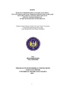 HUBUNGAN PERSEPSI SISWA DAN KEPUASAN SISWA TENTANG MENGAJAR GURU TERHADAP PENGETAHUAN BELAJAR MATA PELAJARAN CAD PADA SISWA KELAS XI JURUSAN TEKNIK PEMESINAN DI SMK MUHAMMADIYAH PRAMBANAN Oleh : IRFAN IKHSANUDIN NIM. 12503247004 Penelitian ini bertujuan untuk mengetahui: (1) Hubungan persepsi siswa tentang mengajar guru terhadap pengetahuan belajar mata pelajaran CAD, (2) Hubungan kepuasan siswa tentang mengajar guru terhadap pengetahuan belajar mata pelajaran CAD, (3) Hubungan persepsi siswa dan kepuasan siswa tentang mengajar guru secara bersama-sama terhadap pengetahuan belajar mata pelajaran CAD. Penelitian ini dilaksanakan di Jurusan Teknik Pemesinan SMK Muhammadiyah Prambanan. Penelitian ini merupakan penelitian korelatif dengan pendekatan Ex Post Facto. Dalam penelitian ini populasinya sebanyak 32 siswa. Sampel dalam penelitian ini adalah semua jumlah populasi yaitu 32 siswa. Jadi penelitian ini adalah penelitian populasi. Teknik dan instrumen pengumpul data dalam penelitian ini menggunakan angket (kuisioner). Pengujian hipotesis penelitian ini dilakukan dengan mencari hubungan koefisien korelasi antara variabel X1 terhadap Y, X2 terhadap Y dan X1X2 terhadap variabel Y. Teknik analisis yang digunakan adalah teknik analisis product moment dan teknik analisis korelasi ganda. Hasil penelitian menunjukkan bahwa: (1) Persepsi siswa tentang mengajar guru berhubungan terhadap pengetahuan belajar mata pelajaran CAD dengan didapatkan nilai r hitung sebesar = 0,862. (2) Kepuasan siswa tentang mengajar guru berhubungan terhadap pengetahuan belajar mata pelajaran CAD dengan didapatkan nilai r hitung sebesar = 0,915. (3) Persepsi siswa dan kepuasan siswa secara bersama-sama berhubungan terhadap pengetahuan belajar mata pelajaran CAD dengan didapatkan harga R hitung sebesar = 0,935. Kata Kunci : Persepsi siswa, kepuasan siswa, mengajar guru, dan pengetahuan belajar.