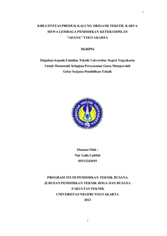 ABSTRAK KREATIVITAS PRODUK KALUNG ORIGAMI TEKSTIL KARYA SISWA LEMBAGA PENDIDIKAN KETERAMPILAN ADANA YOGYAKARTA Oleh: Nur Laila Latifah 05513241019 Penelitian ini bertujuan untuk mengetahui, mengungkap dan menganalisis gambaran kreativitas produk kalung origami tekstil karya siswa jurusan fashion design Lembaga Pendidikan Keterampilan Adana Yogyakarta. Penelitian ini merupakan penelitian deskriptif. Populasi dan sampel dalam penelitian ini adalah seluruh siswa jurusan fashion design Lembaga Pendidikan Keterampilan Adana yang berjumlah 14 orang. Teknik pengambilan data menggunakan lembar unjuk kerja kreativitas produk dengan analisis obyektif pada produk kreatif dan pertimbangan subyektif oleh ahli yang pengukurannya menggunakan indikator Creativity Product Analysis Matrix dengan skala likert. Uji validitas instrumen menggunakan validitas konstrak dengan judgment expert, dan reliabilitas instrumen menggunakan antar-rater. Teknik analisis data yang digunakan adalah teknik analisis diskriptif dengan persentase. Hasil penelitian menunjukkan bahwa kreativitas produk kalung origami tekstil karya siswa Lembaga Pendidikan Adana dengan rerata (M) 79,82. Siswa yang masuk pada klasifikasi katagori sangat kreatif dengan interval nilai (81-100) sebanyak 7 siswa (50%). Sedangkan Siswa yang masuk pada klasifikasi katagori kreatif dengan interval nilai (62-80) sebanyak 7 siswa (50%). Dengan demikian dapat diartikan bahwa kreativitas produk kalung origami tekstil karya siswa Lembaga Pendidikan Keterampilan Adana Yogyakarta termasuk pada katagori yang kreatif dalam aspek kebaruan (novelty), pemecahan masalah (resolution) dan elaboratif. Artinya desain yang diciptakan siswa tergolong menarik dalam hal teknik pembuatan, kombinasi bahan, kombinasi warna dan detail yang berbeda dengan yang lain. Produk kalung yang diciptakan aman, nyaman, sesuai dengan tema, kesempatan pakai dan dibuat sesuai batas waktu yang telah ditentukan. Produk kalung dapat berfungsi sebagai bros, gelang, jepit rambut dan ikat pinggang sehingga sangat fungsional. Kata kunci: Kreativitas, Kalung, Lembaga Pendidikan Keterampilan “Adana”