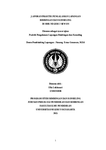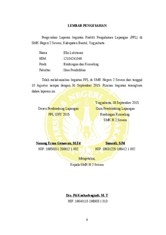 Ella Lukitasari, Ella Lukitasari (2015) LAPORAN PRAKTIK PENGALAMAN LAPANGAN BIMBINGAN DAN KONSELING DI SMK NEGERI 2 SEWON. Project Report. LPPMP, Universitas Negeri Yogyakarta.