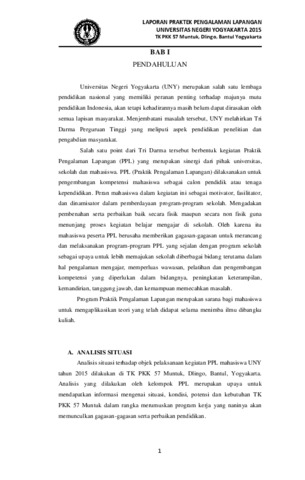 Praktik Pengalaman Lapangan merupakan salah satu mata kuliah wajib tempuh bagi mahasiswa kependidikan S1 untuk memperoleh gelar sarjana di Universitas Negeri Yogyakarta. PPL (Praktik Pengalaman Lapangan) dilaksanakan untuk pengembangan kompetensi mahasiswa sebagai calon pendidik atau tenaga kependidikan.. Program PPL di TK PKK 57 MUNTUK yang beralamat di Muntuk, Muntuk, Dlingo, Bantul dimulai pada tanggal 10 Agustus 2015 – 12 September 2015 dengan beranggotakan 11 (sebelas) mahasiswa. Dengan menjalankan program kerja pengajaran dan non pengajaran. Untuk program pengajaran meliputi sebagai guru utama yang dilaksanakan sebanyak 4 kali dengan total 2 kali mengajar di kelompok A dan 2 kali mengajar di kelompok B. Pelaksanaan praktik pengalaman lapangan berdasarkan rancangan kegiatan yang telah dibuat meliputi observasi pembelajaran, persiapan pembelajaran, konsultasi dengan guru pembimbing, konsultasi DPL PPL, praktik mengajar serta penilaian. Program PPL diharapkan dapat memperluas wawasan dan pengembangan kompetensi dalam bidangnya, dalam hal ini khususnya Pendidikan Anak Usia Dini. Sedangkan untuk program kerja non pengajaran meliputi optimalisasi UKS, optimalisasi perpustakaan, administrasi guru, tamanisasi, penataan ruang kelas, home visit, pendampingan ekstrakulikuler. Program Praktik Pengalaman Lapangan juga merupakan sarana bagi mahasiswa untuk mengaplikasikan teori yang telah didapat selama menimba ilmu dibangku kuliah.