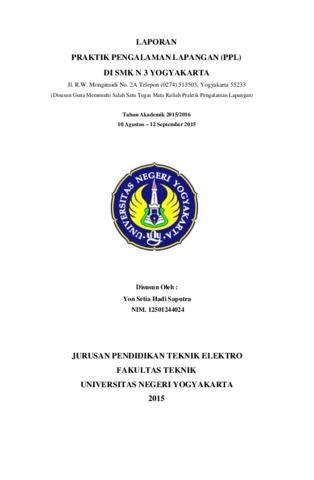 Yon Setia Hadi Saputra, Yon Setia Hadi Saputra (2015) LAPORAN PRAKTIK PENGALAMAN LAPANGAN (PPL) DI SMK N 3 YOGYAKARTA. Project Report. LPPMP, Universitas Negeri Yogyakarta.