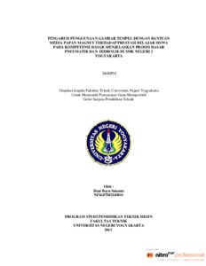 PENGARUH PENGGUNAAN GAMBAR TEMPEL DENGAN BANTUAN MEDIA PAPAN MAGNET TERHADAP PRESTASI BELAJAR SISWA PADA KOMPETENSI DASAR MENJELASKAN PROSES DASAR PNEUMATIK DAN HIDROLIK DI SMK NEGERI 3 YOGYAKARTA Oleh : Deni Bayu Sutanto NIM. 07503245011 ABSTRAK Penelitian ini bertujuan untuk (1) Mengetahui prestasi belajar rangkaian komponen hidrolik setelah menggunakan gambar tempel dengan bantuan media papan magnet, (2) Mengetahui pengaruh penggunaan gambar tempel dengan bantuan media papan magnet terhadap prestasi belajar rangkaian komponen hidrolik, (3) Mengetahui perbedaan prestasi belajar antara kelas ekperimen dan kelas kontrol. Setting penelitian adalah SMK N 3 Yogyakarta yang berlokasi di Jl. W.Monginsidi No. 2A Yogyakarta. Subjek Penelitian adalah siswa kelas XI Jurusan Permesinan tahun ajaran 2010/2011. Terdiri dari data responden ahli materi (1 dosen), ahli media (1 dosen), uji coba dalam kelompok eksperimen (31 siswa) dan kelompok kontrol (30 siswa). Instrumen yang digunakan dalam penelitian ini adalah post-test. Untuk tes post-test dengan jumlah soal 40 butir. Data dianalisis secara deskriptif kuantitatif dan dikonversikan menjadi data kualitatif untuk mengetahui kriteria penilaian media dan kelayakan media yang sedang dikembangkan. Hasil penelitian ditemukan bahwa: (1) prestasi belajar siswa menjadi lebih baik bila dibandingkan dengan sebelum menggunakan gambar tempel dengan bantuan media papan magnet. (2) penggunaan gambar tempel dengan bantuan media papan magnet berpengaruh terhadap prestasi belajar siswa. Hal ini dapat dilihat dari hasil analisis yang menunjukkan nilai t-hitung sebesar 4,279 dan tingkat signifikannya 0,000<0,05. (3) ada perbedaan prestasi belajar siswa antara kelas yang diberikan perlakuan dengan kelas yang tidak diberikan perlakuan menggunakan gambar tempel dengan bantuan media papan magnet. Kelas eksperimen (kelas yang diberi perlakuan) memiliki prestasi yang lebih baik dibandingkan dengan kelas kontrol (kelas tanpa perlakuan). . Kata kunci : Gambar Tempel Dengan Bantuan Media Papan Magnet, Pembelajaran Rangkaian Komponen Hidrolik