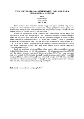 Amalia, Adlina (2015) STUDI FAKTOR pH PADA ADSORPSI KATION Ca(II) OLEH SILIKA TERMODIFIKASI SULFONAT. S1 thesis, Fakultas Matematika dan Ilmu Pengetahuan Alam UNY.