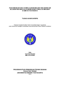 PENGEMBANGAN VIDEO PEMBELAJARAN MENJAHIT MACAM-MACAM BELAHAN PADA MATA PELAJARAN DASAR TEKNOLOGI MENJAHIT DI SMK N 6 YOGYAKARTA Oleh: Tyas Putri Wardani NIM. 13513247009 ABSTRAK Tujuan penelitian ini untuk: (1) menghasilkan media video pembelajaran kompetensi dasar menjahit macam-macam belahan dan (2) mengetahui kelayakan media video pembelajaran kompetensi dasar menjahit macam-macam belahan dari hasil pengujian Jenis penelitian ini adalah penelitian pengembangan (Research & Development). Penelitian pengembangan ini menggunakan model pengembangan 4D menurut Thiagarajan. Penelitian pengembangan ini melalui empat tahapan yaitu: (1) Tahap pendefisian ( define) berupa analisis kurikulum, analisis peserta didik, analisis materi dan merumuskan tujuan, (2) Tahap perancangan ( design), (3) Tahap pengembangan ( develop) dan (4) Tahap pendesiminasian/ penyebarluasan (disseminate). Validasi video pembelajaran dilakukan oleh ahli media dan ahli materi. Subjek dalam penelitian ini berjumlah 27 peserta didik. Pada uji coba skala kecil dipilih 6 peserta didik dan 27 peserta didik untuk uji coba skala besar. Metode pengumpulan data menggunakan metode observasi, wawancara, dan angket. Validitas instrumen yang digunakan adalah validitas konstruk. Pengujian reliabilitas menggunakan Alpha Cronbach. Analisis dilakukan dengan analisis deskriptif Hasil penelitian ini adalah: 1) media video pembelajaran dilakukan dengan a) analisis kebutuhan produk dilakukan dengan menganalisis kurikulum sehingga diketahui kompetensi dasar yang memerlukan pengembangan video, yaitu menjahit macammacam belahan, b) mengembangkan video dilakukan sesuai rancangan pengembangan vidio meliputi pra produksi, produksi, dan pasca produksi, c) validasi ahli dan revisi, dengan meminta bantuan para ahli untuk menilai video, dan melakukan revisi sesuai saran, d) uji lapangan skala kecil dengan mengujikan kepada 6 peserta didik, e) uji coba lapangan skala besar diujikan pada 27 peserta didik Tata Busana, dan menghasilkan produk berupa video pembelajaran menjahit macam-macam belahan. (2) kelayakan video pembelajaran menjahit macam-macam belahan berdasarkan penilaian dari 3 ahli materi dan 3 ahli media. Hasil validasi ahli materi dan ahli media diperoleh hasil valid dan layak dengan presentase 100%. Kelayakan ujicoba kelompok kecil secara keseluruhan diperoleh hasil sangat layak dengan presentase 50%% dan kategori layak sebesar 33,33%. Hasil kelayakan uji coba kelompok besar video pembelajaran dalam kategori sangat layak dengan presentase sebesar 44,44% dan kategori layak sebesar 55,56%. Hal ini menunjukkan bahwa video pembelajaran sudah memenuhi aspek, fungsi dan manfaat sebagai media pembelajaran, aspek visual media, aspek audio media, materi pembelajaran, dan aspek penyajian materi, sehingga video pembelajaran menjahit macam-macam belahan dapat digunakan sebagai media pembelajaran pada kometensi membuat macam-macam belahan di SMK N 6 Yogyakarta. Kata kunci: pengembangan, video pembelajaran, menjahit macam-macam belahan