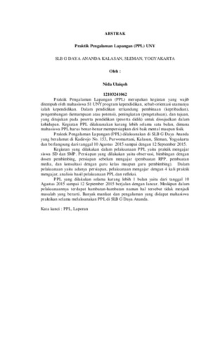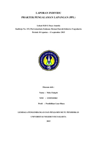 Nida Ulaiqoh, Nida Ulaiqoh (2015) LAPORAN INDIVIDU PRAKTEK PENGALAMAN LAPANGAN (PPL) Lokasi SLB G Daya Ananda. Project Report. LPPMP, Universitas Negeri Yogyakarta.