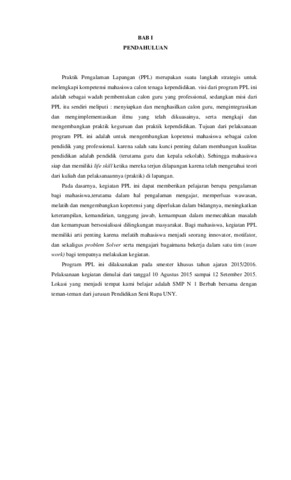 Kegiatan Praktek Pengalaman Lapangan (PPL) merupakan salah satu wadah bagi mahasiswa untuk mengaplikasikan ilmu yang telah diperoleh selama menempuh pendidikan di perguruan tinggi. PPL bertujuan untuk memberikan kesempatan kepada mahasiswa agar bisa melakukan praktik mengajar secara langsung dan dapat memperoleh pengalaman serta menyelesaikan permasalahan yang dihadapi langsung di dunia sekolah, baik yang berkaitan dengan proses pembelajaran maupun kegiatan adminitrasi pendidikan. Kegiatan PPL ini juga berfungsi untuk melatih mental mahasiswa dalam menghadapi anak didik secara langsung, hal ini akan memberikan pengalaman yang lebih kepada peserta PPL dan memperluas wawasan dalam proses belajar-mengajar. Kegiatan PPL ini dilaksanakan oleh mahasiswa Universitas Negeri Yogyakarta secara langsung di sekolah selama kurang lebih 1 bulan (5 minggu) bulan mulai dari tanggal 10 Agustus 2015 sampai dengan 12 September 2015. Selama kegiatan PPL, mahasiswa praktikan turun langsung untuk mengajar didalam kelas. 6x pertemuan adalah target minimal yang harus dilakukan oleh mahasiswa. Sekolah yang dijadikan lokasi PPL adalah SMP N 1 Berbah. Disekolah ini mahasiswa memperoleh kepercayaan untuk mengampu empat (4) kelas, yang semuanya merupakan kelas VIII yaitu kelas VIII A, VIII B, VIII C, dan VIII D. Metode yang digunakan adalah Pendekatan Kontekstual, Diskusi, tanya Jawab, Dan Tugas merupakan metode yang dipilih untuk proses pembelajaran di kelas agar sesuai dengan tuntunan Kurikulum Tingkat Satuan Pendidikan (KTSP) 2006 yang memungkinkan guru lebih aktif memancing siswa untuk lebih aktif dan kreatif mengikuti pembelajaran. Dengan menggunakan alat peraga berupa gambar, alat dan bahan batik, serta LKS merupakan media yang digunakan untuk menarik perhatian siswa agar lebih aktif dan partisipatif dalam mengikuti pembelajaran. Banyak kendala yang dialami selama PPL, namun hal tersebut bukanlah penghalang yang besar bagi mahasiswa untuk dapat melaksanakan kegiatan PPL ini. Dengan adanya kegiatan PPL ini, mahasiswa praktikan dapat memperoleh bekal pangalaman dan gambaran nyata tentang berbagai hal dan kegiatan yang terkait dengan dunia pendidikan khususnya di Sekolah. Kerja keras, keikhlasan dan disiplin merupakan kunci suksesnya pelaksanaan PPL ini. Pada akhirnya, dengan terselesaikannya kegiatan PPL ini diharapkan dapat tercipta calon tenaga pendidik yang professional dan berkualitas untuk pendidikan Indonesia yang lebih baik. Dan diharapkan kerjasama dan koordinasi antar pihak sekolah, universitas, dan mahasiwa dapat berjalan dengan lebih baik lagi.