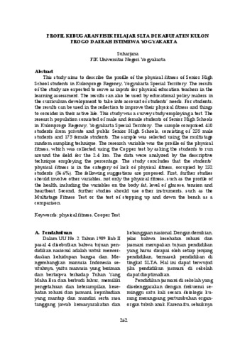 Suharjana, Dr. PROFIL KEBUGARAN FISIK PELAJAR SLTA DI KABUPATEN KULON PROGO DAERAH ISTIMEWA YOGYAKARTA. Cakrala Pendidikan Edisi November 2008.
