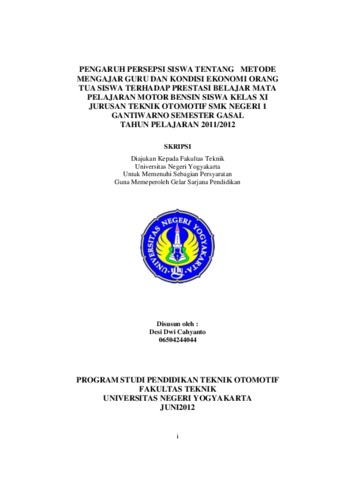 PENGARUH PERSEPSI SISWA TENTANG METODE MENGAJAR GURU DAN KONDISI EKONOMI ORANG TUA SISWA TERHADAP PRESTASI BELAJAR MATA PELAJARAN MOTOR BENSIN SISWA KELAS XI JURUSAN TEKNIK OTOMOTIF SMK NEGERI 1 GANTIWARNO SEMESTER GASAL TAHUN PELAJARAN 2011/2012 Oleh Desi Dwi Cahyanto 06504244044 ABSTRAK Penelitian ini bertujuan untuk mengetahui (1) Pengaruh persepsi siswa tentang metode mengajar guru terhadap prestasi belajar mata pelajaran motor bensin siswa kelas XI jurusan teknik otomotif SMK Negeri 1 Gantiwarno semester gasal tahun pelajaran 2011/2012.(2) Pengaruh kondisi ekonomi orang tua siswa terhadap prestasi belajar mata pelajaran motor bensin siswa kelas XI jurusan teknik otomotif SMK Negeri 1 Gantiwarno semester gasal tahun pelajaran 2011/2012.(3)Pengaruh persepsi siswa tentang metode mengajar guru dan kondisi ekonomi orang tua siswa secara bersama-sama terhadap prestasi belajar mata pelajaran motor bensin siswa kelas XI jurusan teknik otomotif SMK Negeri 1 Gantiwarno semester gasal tahun pelajaran 2011/2012. Penelitian ini merupakan penelitian expost facto. Jumlah populasi penelitian ini sebanyak 77 siswa. Karena jumlah populasi kurang dari 100 sehingga seluruhnya dijadikan objek penelitian. Data dikumpulkan dengan menggunakan metode angket dengan skala likert dan dokumentasi. Sebelum dilakukan analisis data terlebih dahulu diadakan pengujian persyaratan analisis yang meliputi uji normalitas, uji linieritas dan uji multikolinieritas. Metode analisis yang digunakan adalah analisis regresi sederhana dan regresi ganda. Hasil penelitian ini menunjukkan bahwa: (1) terdapat pengaruh positif dan signifikan persepsi siswa tentang metode mengajar guru terhadap prestasi belajar motor bensin, dibuktikan r x1y = 0,411, r 2x1y= 0,169, t hitung = 3,984 dengan p-value sebesar 0,000. (2) terdapat pengaruh positif dan signifikan kondisi ekonomi orang tua siswa terhadap prestasi belajar motor bensin, dibuktikan r x2y = 0,274, r 2x1y= 0,075, t hitung = 2,219 dengan p-value sebesar 0,000. (3) terdapat pengaruh positif dan signifikan persepsi siswa tentang metode mengajar guru dan kondisi ekonomi orang tua siswa secara bersama-sama terhadap prestasi belajar motor bensin, dibuktikan Ry(12) = 0,459, R2y(12) = 0,2103, Fhitung = 10,250 dengan p-value sebesar 0,000