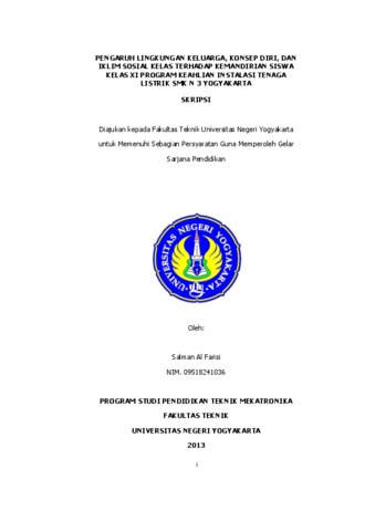 PENGARUH LINGKUNGAN KELUARGA, KONSEP DIRI, DAN IKLIM SOSIAL KELAS TERHADAP KEMANDIRIAN SISWA KELAS XI PROGRAM KEAHLIAN INSTALASI TENAGA LISTRIK SMK N 3 YOGYAKARTA Oleh: Salman Al Farisi NIM. 09518241036 ABSTRAK Penelitian ini bertujuan mengetahui: (1) pengaruh antara lingkungan keluarga terhadap kemandirian, (2) pengaruh antara konsep diri terhadap kemandirian, (3) pengaruh antara iklim sosial kelas terhadap kemandirian, dan (4) pengaruh antara lingkungan keluarga, konsep diri, dan iklim sosial kelas secara simultan terhadap kemandirian. Penelitian ini merupakan penelitian korelasional dengan pendekatan expost facto. Populasi penelitian adalah siswa kelas XI Program Keahlian Instalasi Tenaga Listrik SMK N 3 Yogyakarta dengan sampel berjumlah 80 siswa yang diperoleh melalui teknik sampling proposional. Metode pengumpulan data untuk semua variabel menggunakan metode kuesioner dengan instrumen penelitian berupa angket. Analisis data dalam penelitian ini menggunakan analisis deskriptif, analisis regresi sederhana dan regresi berganda. Hasil penelitian ini dapat disimpulkan: (1) lingkungan keluarga sebagian besar siswa (60,00%) termasuk dalam kategori sedang, (2) konsep diri sebagian siswa (82.50%) termasuk dalam kategori sedang, (3) iklim sosial kelas sebagian besar siswa (63.75%) termasuk dalam kategori sedang, (4) kemandirian sebagian siswa (71.25%) termasuk dalam kategori sedang, (5) terdapat pengaruh yang positif pada lingkungan keluarga sebesar 27,4% terhadap kemandirian, (6) terdapat pengaruh yang positif pada konsep diri sebesar 65,00% terhadap kemandirian, (7) terdapat pengaruh yang positif pada iklim sosial kelas sebesar 34,1% terhadap kemandirian, dan (8) terdapat pengaruh yang positif pada lingkungan keluarga, konsep diri, dan iklim sosial kelas secara simultan sebesar 67,10% terhadap kemandirian. Kata kunci: lingkungan keluarga, konsep diri, iklim sosial kelas dan kemandirian