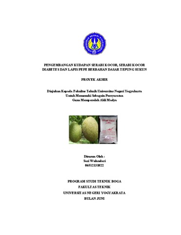 PENGEMBANGAN KUDAPAN SERABI KOCOR, SERABI KOCOR DIABETES DAN LAPIS PEPE BERBAHAN DASAR TEPUNG SUKUN Oleh: Sari Wulandari 0651213102 ABSTRAK Proyek Akhir yang berjudul pengembangan kudapan Serabi Kocor, Serabi Kocor Diabets, dan Lapis Pepe Berbahan dasar tepung sukun ini bertujuan untuk 1) Mengetahui formula resep yang tepat untuk menghasilkan Serabi Kocor, Serabi Kocor Diabets, dan Lapis Pepe berbahan dasar tepung sukun, 2)Mengetahui proses pengolahan yang tepat sehingga menghasilkan produk Serabi Kocor, Serabi Kocor Diabets, dan Lapis Pepe berbahan dasar tepung sukun yang dapat diterima oleh masyarakat luas, 3) Mengetahui teknik penyajian yang tepat sehingga produk yang dihasilkan menarik, 4) Mengetahui penilaian panelis terhadap produk Serabi Kocor, Serabi Kocor Diabets, dan Lapis Pepe yang berbahan dasar tepung sukun. Penelitian ini dilakukan pada bulan April-Juni, di Lab Boga, Metode yang digunakan dalam pembuatan produk ini adalah R&D melalui beberapa tahap yaitu, 1) Menganalisis resep, 2) Merancang atau mendesain resep Serabi Kocor, Serabi Kocor Diabets, dan Lapis Pepe yang baru, 3) Melakukan eksperimen berupa uji coba 1,2,dan 3 selanjutnya melakukan validasi I dan validasi II dengan membuat produk dan memperbaiki resep hasil pengembangan sesuai dengan saran dosen hingga menemukan formula resep yang tepat, 4) Menyebar luaskan resep hasil pengembangan dengan cara Uji Panelis, 5) Menganalisis data yang digunakan berupa kategorisasi untuk mengetahui rasa, warna, aroma, tekstur dan penyajian. Berdasarkan dari pembahasan di atas maka dapat disimpulkan, 1) Formula resep yang tepat pada pembuatan Serabi Kocor adalah 50% tepung sukun, formula Serabi Kocor Diabetes menggunakan Formula 50% (tepung sukun) : 50% (Tepung Beras), 2) Teknik pengolahan dalam pembuatan Serabi Kocor dan Serabi kocor diabetes dengan teknik olah mixing, boilling, Lapis pepe menggunakan teknik dikukus dan dicetak, 3) Teknik penyajian yang sesuaikan dengan produk Serabi Kocor dengan bentuk bintang, dihias dengan daun pandan, menggunakan alat saji dari mika. Sedangkan teknik penyajian yang sesuai untuk Serabi kocor diabets dengan bentuk love warna pink. Untuk Lapis pepe teknik penyajian yang tepat dengan bentuk bulat. 4) Hasil penilaian produk dari 30 panelis ketika eksperimen sendiri produk Peroyek Akhir dengan kriteria penilaian yang sudah ditentukan, kudapan serabi kocor dengan nilai total yaitu 85,3%. serabi kocor diabets dengan nilai total yaitu 82,1% dan lapis pepe dengan nilai total yaitu .90,4%, berdasarkan kategori penilaian dapat disimpulkan bahwa kudapan Lapis pepe yang banyak diminati.