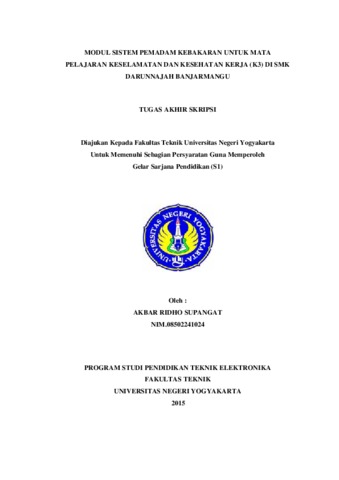 MODUL SISTEM PEMADAM KEBAKARAN UNTUK MATA PELAJARAN KESELAMATAN DAN KESEHATAN KERJA (K3) DI SMK DARUNNAJAH BANJARMANGU Oleh: Akbar Ridho Supangat NIM. 08502241024 ABSTRAK Penelitian ini bertujuan untuk menghasilkan modul pembelajaran Sistem Pemadam Kebakaran dan tingkat kelayakan modul pembelajaran Sistem Pemadam Kebakaran sebagai modul pembelajaran mata pelajaran Keselamatan dan Kesehatan kerja (K3) pada Jurusan Teknik Broadcasting di SMK Darunnajah Banjarmangu. Penelitian ini merupakan penelitian Research and Development. Objek penelitian ini adalah Modul Pembelajaran Sistem Pemadam Kebakaran. Tahap penyusunan modul meliputi 1). Potensi dan masalah, 2). Pengumpulan data, 3). Desain produk, 4). Validasi desain, 5). Revisi desain, 6). Uji coba produk, dan 7). Revisi produk. Metode yang digunakan dalam pengumpulan data menggunakan Angket. Adapun validasi media pembelajaran melibatkan dua ahli materi pembelajaran dan dua ahli media pembelajaran dan 30 siswa untuk diminta tanggapannya. Hasil penelitian menunjukkan bahwa modul pembelajaran Sistem Pemadam Kebakaran ini terdiri dari bagian lembar sampul, kata pengantar, daftar isi, daftar gambar, daftar tabel, glossary, mekanisme pembelajaran, pendahuluan, petunjuk penggunaan modul, kegiatan belajar 1, kegiatan belajar 2, rangkuman, latihan soal, umpan balik, tindak lanjut, kunci jawaban dan daftar pustaka. Hasil validasi isi oleh ahli materi pembelajaran memperoleh tingkat validitas dengan persentase 87.5% dengan kategori sangat layak, validasi konstruk oleh ahli media pembelajaran memperoleh tingkat validitas dengan persentase 82.925% dengan kategori sangat layak. Sedangkan tanggapan siswa di SMK Darunnajah Banjarmangu mendapatkan validitas sebesar 76.77% dengan kategori sangat layak. Kata kunci: modul, pembelajaran, sistem pemadam kebakaran