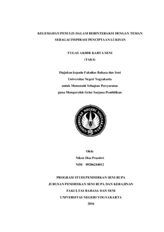 ABSTRAK Tujuan penulisan ini adalah untuk mendeskripsikn konsep, tema, proses visualisasi, teknik, dan bentuk lukisan dengan judul Kelemahan Penulis dalam berinteraksi dengan Teman sebagai Inspirasi Penciptaan Lukisan. Metode penciptaan lukisan adalah observasi, improvisasi, dan visualisasi. Metode observasi yaitu dengan pengamatan keseharian keluarga dan mencari informasi di internet. Improvisasi dengan membuat sketsa. Visualisasi dilakukan dengan mewujudkan konsep menjadi bentuk lukisan menggunakan media cat akrilik pada kanvas. Dari hasil pembahasan dan proses penciptaan yang dilakukan dapat disimpulkan hal-hal berikut: 1) Konsep penciptaan lukisan yakni kelemahan penulis dalam berinteraksi dengan teman. 2) Tema lukisan adalah keseharian penulis dalam menghadapi kesendirian karena lemah dalam berinteraksi dengan teman yang tidak satu hobi. 3) Proses visualisasi yakni memindahkan sketsa kedalam kanvas. 4) Teknik pewarnaan menggunakan teknik akuarel dan plakat. Lukisan yang dihasilkan sebanyak 7 buah dengan ukuran 3x 80x100cm dan 3x 10x120cm, dengan judul : 1) Sinau ndak didukani ibu. 2) Dolanan Layangan. 3) Kamarku Duniaku 1. 4) Kamarku Duniaku 2. 5) Hang Out! Girl! 1. 6) Hang Out! Girl! 2. 7) Cosplay.