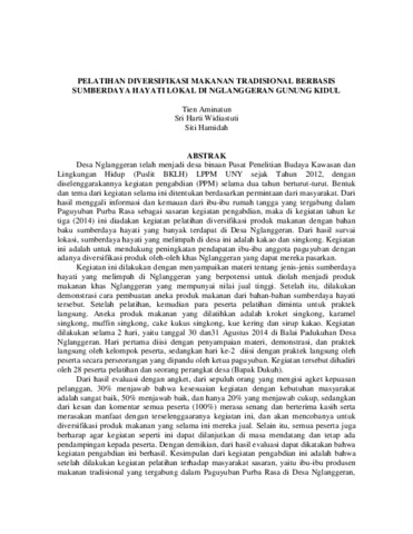Tien, Aminatun and Sri Harti, Widyastuti, M.Hum. and Siti, Hamidah (2014) PELATIHAN DIVERSIFIKASI MAKANAN TRADISIONAL BERBASIS SUMBERDAYA HAYATI LOKAL DI NGLANGGERAN GUNUNG KIDUL. [Experiment/Research]