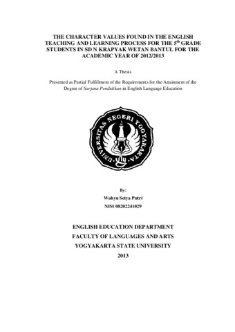 THE CHARACTER VALUES FOUND IN THE ENGLISH TEACHING AND LEARNING PROCESS FOR THE 5th GRADE STUDENTS IN SD N KRAPYAK WETAN BANTUL FOR THE ACADEMIC YEAR OF 2012/2013 By:Wahyu Setya Putri NIM 08202241029 ABSTRACT The objectives of the research is to analyze the character values which are found in the English teaching and learning process. The subjects of the research is the teacher of SD N Krapyak Wetan Bantul. The object of the research is focused on the character values in the English teaching and learning process. The type of this research is a case study. The data are collected through the observations and the interview. The observations are done to get the data from the English teacher to analyze the values in the teaching and learning process. Then, those data and information are recorded through the documentations. After they are collected, they are analyzed to find out the values are included in the English teaching and learning process. Triangulation is done by checking the findings with the research respondents through the interview. There are several character values in the teaching and learning process. The teacher also develops them so that those values are not only from the Ministry of Education, but also she integrates more values in her teaching. She internalizes those values through the method, the materials, the classroom activities, and interaction. She also becomes the model of the character values. They are care, honesty, hard working, religiosity, tolerance, independence, firmness, discipline, communication, responsibility, respect, helpfulness, creativity, participation, and democracy.