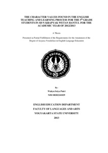 Setya Putri, Wahyu (2013) THE CHARACTER VALUES FOUND IN THE ENGLISH TEACHING AND LEARNING PROCESS FOR THE 5th GRADE STUDENTS IN SD N KRAPYAK WETAN BANTUL FOR THE ACADEMIC YEAR OF 2012/2013. S1 thesis, FBS UNY.