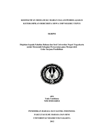 KEEFEKTIFAN MEDIA BUKU HARIAN DALAM PEMBELAJARAN KETERAMPILAN BERCERITA SISWA SMP NEGERI 3 TEPUS oleh Yuda Yustiana NIM 05201244014 ABSTRAK Penelitian ini bertujuan untuk mengetahui (1) adanya perbedaan keterampilan bercerita antara siswa yang diajar menggunakan media buku harian dengan siswa yang diajar tanpa menggunakan buku harian, (2) keefektifan penggunaan media buku harian dibandingkan dengan pembelajaran tanpa menggunakan media buku harian dalam pembelajaran bercerita. Penelitian ini menggunakan desain penelitian eksperimen dengan rancangan pretest-postest control group design. Populasi penelitian ini adalah siswa kelas VII SMP Negeri 3 Tepus. Sampelnya adalah dua kelas yang masingmasing memiliki 20 siswa, sehingga jumlah sampel keseluruhan adalah 40 siswa. Kelas VII A sebagai kelompok eksperimen dan kelas VII B sebagai kelompok kontrol. Teknik pengumpulan data yang digunakan dalam penelitian ini adalah pengamatan tes bercerita. Validitas instrumen yang digunakan dalam penelitian ini adalah validitas isi yaitu dengan dikonsultasikan kepada ahlinya (expert judgement). Uji reliabilitas instrumen menggunakan Alpha Cronbach. Hasil indeks reliabilitas tersebut berarti instrumen yang digunakan memiliki koefisien reliabilitas yang sangat tinggi. Teknik analisis data menggunakan uji-t. Kesimpulan penelitian ini ada dua, yaitu: (1) terdapat perbedaan yang signifikan antara kemampuan bercerita pengalaman mengesankan siswa kelas VII SMP Negeri 3 Tepus yang dilaksanakan menggunakan media buku harian dibandingkan dengan siswa yang dilaksanakan tanpa menggunakan media buku harian. Hasil perhitungan uji-t menunjukkan bahwa t hitung lebih besar dari t tabel (8,759 > 1,380) dan p kurang dari 0,05 (0,00 < 0,05). (2) Pembelajaran bercerita pengalaman mengesankan siswa kelas VII SMP Negeri 3 Tepus lebih efektif menggunakan media buku harian dibandingkan dengan pembelajaran bercerita pengalaman mengesankan tanpa menggunakan media buku harian. Perhitungan uji-t hitung lebih besar dari t tabel (8,721 > 1,380) dan p kurang dari 0,05 (0,00 < 0,05).