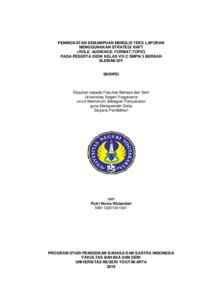 Novia Wulandari, Putri (2016) PENINGKATAN KEMAMPUAN MENULIS TEKS LAPORAN MENGGUNAKAN STRATEGI RAFT (ROLE, AUDIENCE, FORMAT,TOPIC) PADA PESERTA DIDIK KELAS VIII C SMPN 3 BERBAH SLEMAN DIY. S1 thesis, Universitas Negeri Yogyakarta.
