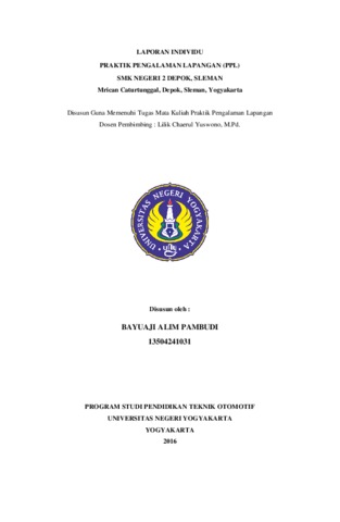 BAYUAJI ALIM PAMBUDI, BAYUAJI ALIM PAMBUDI (2016) LAPORAN INDIVIDU PRAKTIK PENGALAMAN LAPANGAN (PPL) SMK NEGERI 2 DEPOK, SLEMAN Mrican Caturtunggal, Depok, Sleman, Yogyakarta. Project Report. LPPMP, Universitas Negeri Yogyakarta.