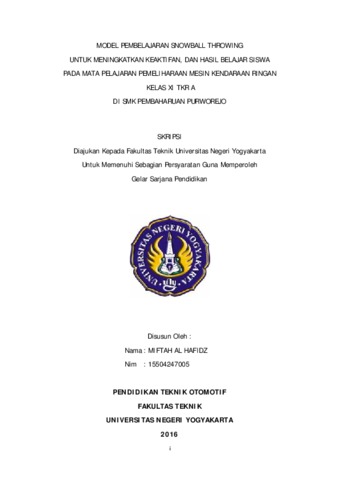 Miftah, Al Hafidz (2016) MODEL PEMBELAJARAN SNOWBALL THROWING UNTUK MENINGKATKAN KEAKTIFAN, DAN HASIL BELAJAR SISWA PADA MATA PELAJARAN PEMELIHARAAN MESIN KENDARAAN RINGAN KELAS XI TKR A DI SMK PEMBAHARUAN PURWOREJO. S1 thesis, UNY.