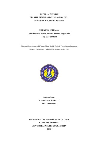 LULUK PUJI RAHAYU, LULUK PUJI RAHAYU (2016) LAPORAN INDIVIDU PRAKTIK PENGALAMAN LAPANGAN (PPL) SEMESTER KHUSUS TAHUN 2016 SMK YPKK 2 SLEMAN Jalan Pemuda, Wadas, Tridadi, Sleman, Yogyakarta Telp. (0274) 868394. Project Report. LPPMP, Universitas Negeri Yogyakarta.