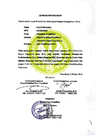 Praktik Pengalaman Lapangan merupakan salah satu mata kuliah wajib yang harus ditempuh oleh seluruh mahasiswa aktif pada jurusan kependidikan di lingkungan kampus Universitas Negeri Yogyakarta. Kegiatan Praktik Pengalaman Lapangan (PPL) ini adalah kesempatan bagi mahasiswa untuk mengaplikasikan/menerapkan ilmu yang telah dipelajari di bangku kuliahan dan dilaksanakan di Subbag ADP (Adminitrasi Data dan Pelaporan) Dinas Pendidikan Kota Yogyakarta periode 15 Juli hingga 15 September 2016. Tujuan dari laporan PPL ini adalah mendeskripsikan laporan kegiatan yang telah dilakukukan selama PPL. Lokasi Praktik Pengalaman Lapangan (PPL) pada periode ini adalah Dinas Pendidikan Kota Yogyakarta. Sebelum penerjunan, tim PPL telah melakukan observasi untuk mengetahui program apa yang dapat diteliti selama praktek pengalaman lapangan akan dilaksanakan. Selain observasi metode yang digunakan adalah wawancara. Berdasar dari hasil observasi dan wawancara yang telah dilakukan pada akhirnya tersusun program peneletian dengan judul “Kebijakan Peningkatan Profesionalisme Guru Melalui Program PKG pada Sekolah Menengah Atas Negeri di Kota Yogyakarta” Melalui kegiatan PPL ini mahasiswa mendapatkan bekal pengalaman dan gambaran nyata tentang kegiatan dalam dunia pendidikan khususnya di instansi kependidikan. Sehingga ilmu yang didapatkan selama belajar di dunia perkuliahan tidak hanya bersifat teoritis saja. Dengan terlaksanakannya kegiatan PPL ini diharapkan dapat memberikan pengalaman nyata dan langsung kepada mahasiswa sebagai calon tenaga kependidikan, sehingga mahasiswa dapat mengimplementasikan, mempersiapkan, dan mengembangkan kemampuannya sebagai tenaga kependidikan dan mendorong terciptanya tenaga kependidikan yang professional.
