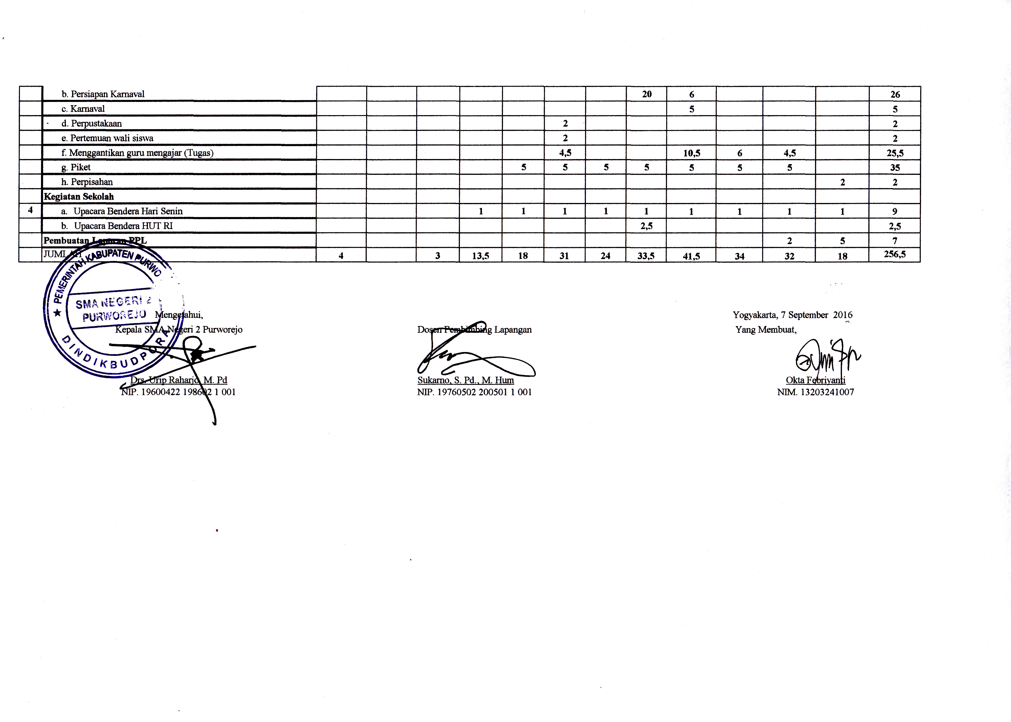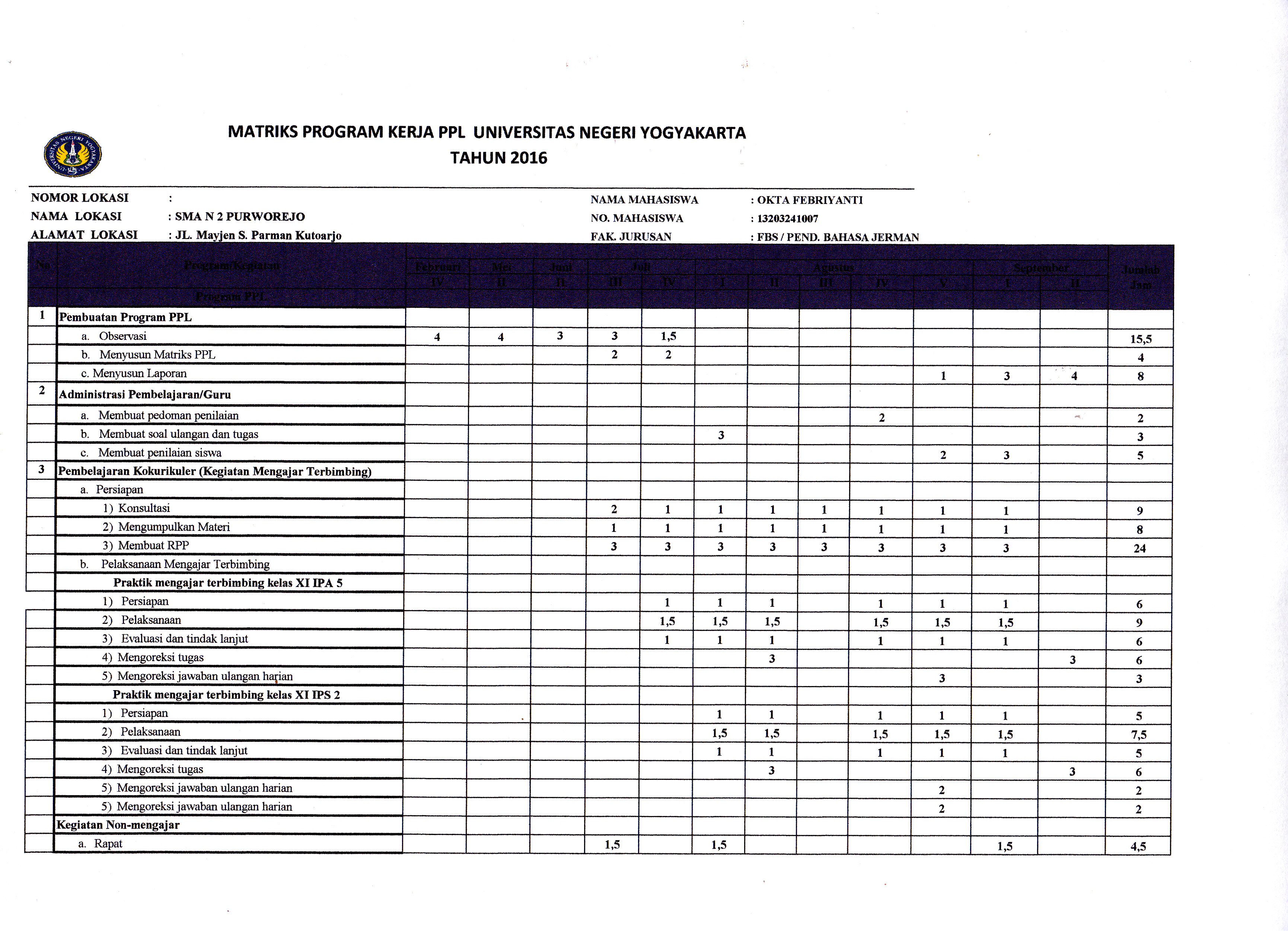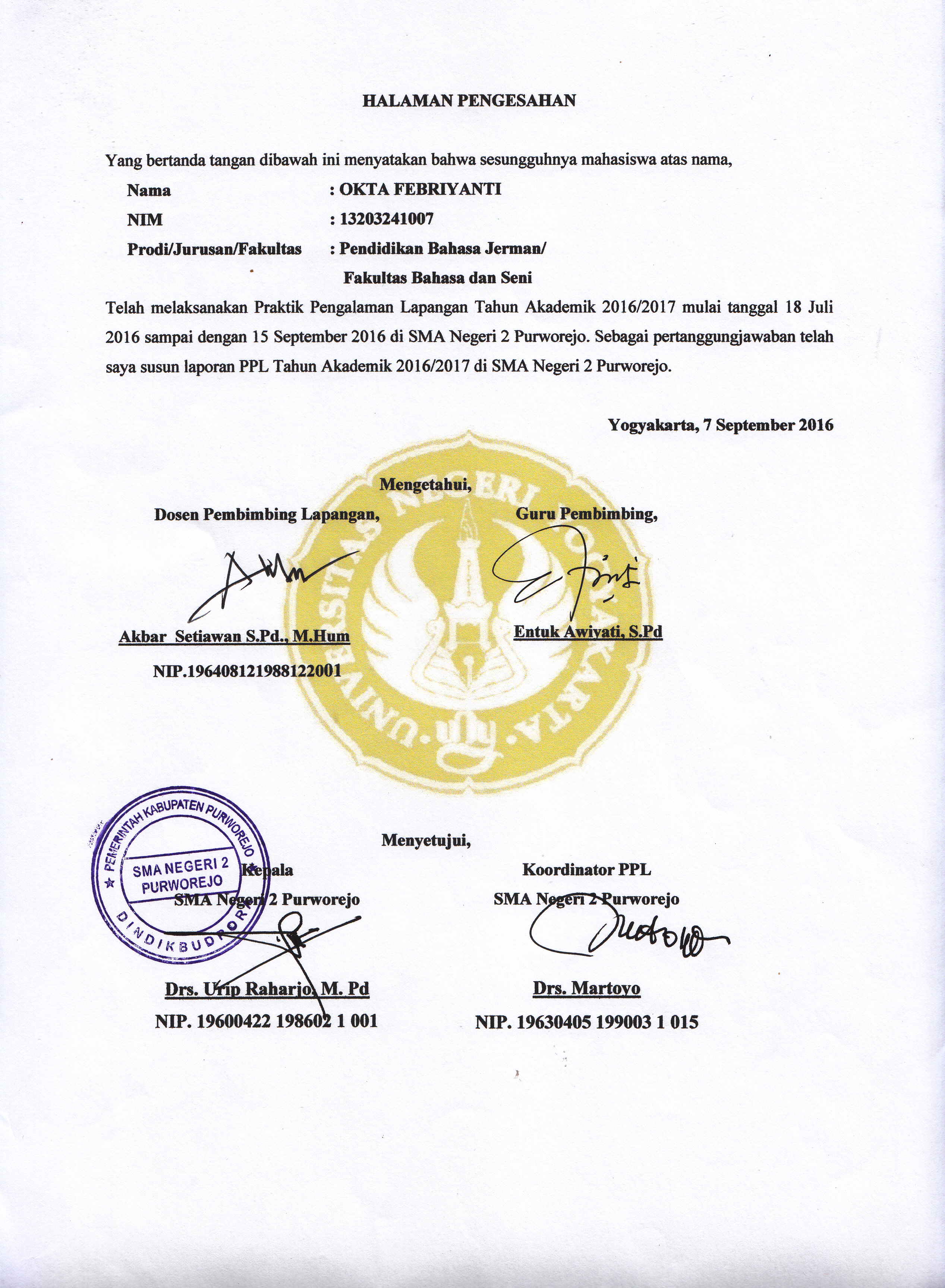 FEBRIYANTI, OKTA (2016) LAPORAN INDIVIDU PRAKTIK PENGALAMAN LAPANGAN (PPL) SMA NEGERI 2 PURWOREJO. Project Report. LPPMP, Universitas Negeri Yogyakarta.