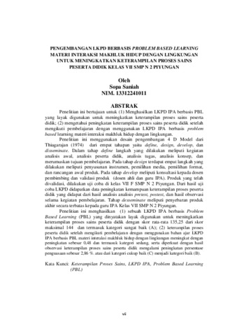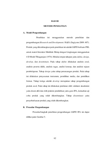 Penelitian ini bertujuan untuk (1) Menghasilkan LKPD IPA berbasis PBL yang layak digunakan untuk meningkatkan keterampilan proses sains peserta didik; (2) mengetahui peningkatan keterampilan proses sains peserta didik setelah mengikuti pembelajaran dengan menggunakan LKPD IPA berbasis problem based learning materi interaksi makhluk hidup dengan lingkungan. Penelitian ini menggunakan desain pengembangan 4 D Model dari Thiagarajan (1974) dari empat tahapan yaitu define, design, develop, dan disseminate. Dalam tahap define langkah yang dilakukan meliputi kegiatan analisis awal, analisis peserta didik, analisis tugas, analisis konsep, dan merumuskan tujuan pembelajaran. Pada tahap design terdapat empat langkah yang dilakukan meliputi penyusunan instrumen, pemilihan media, pemilihan format, dan rancangan awal produk. Pada tahap develop meliputi konsultasi kepada dosen pembimbing dan validasi produk (dosen ahli dan guru IPA). Produk yang telah divalidasi, dilakukan uji coba di kelas VII F SMP N 2 Piyungan. Dari hasil uji coba LKPD didapatkan data peningkatan kemampuan keterampilan proses peserta didik yang didapat dari hasil analisis analisis pretest, postest, dan hasil observasi selama kegiatan pembelajaran. Tahap desseminate meliputi penyebaran produk akhir secara terbatas kepada guru IPA Kelas VII SMP N 2 Piyungan. Penelitian ini menghasilkan (1) sebuah LKPD IPA berbasis Problem Based Learning (PBL) yang dinyatakan layak digunakan untuk meningkatkan keterampilan proses sains peserta didik dengan skor rata-rata 135,25 dari skor maksimal 144 dan termasuk kategori sangat baik (A); (2) keterampilan proses peserta didik setelah mengikuti pembelajaran dengan menggunakan bahan ajar LKPD IPA berbasis PBL materi interaksi makhluk hidup dengan lingkungan meningkat dengan peningkatan sebesar 0,48 dan termasuk kategori sedang, serta diperkuat dengan hasil observasi keterampilan proses sains peserta didik mengalami peningkatan persentase penguasaan sebesar 2,86 %. atau dari kategori cukup baik (C) menjadi kategori baik (B). Kata Kunci: Keterampilan Proses Sains, LKPD IPA, Problem Based Learning (PBL) The aims of this research are (1) to produce student worksheets based on Problem Based Learning that are feasible to improve science process of learners; (2) determine the improvement of science process skills after participating in learning using student worksheet in the subject matter Interactions of living organisms with the environment. This research uses 4 D Models by Thiagarajan (1974) which has four phases, define, design, develop, and disseminate. In the define phase there are steps taken include the activities of the front-end analysis, learners analysis, task analysis, concept analysis, and specifying instructional objectives. At the design stage there are four steps undertaken include the constructing criterio-reference tests, media selection, format selection, and initial design. At develop phase, student worksheet produced assessed by consultans and then assessed by axpert (expert lecturer and science teacher). Student worksheet products that has been validated then tested to students VII F SMP N 2 Piyungan. From the test results obtained improvement of capability science process skills. Improvement of science process skills known by analized of pretest and postest results, used paired t-test to known signification score of pretest and postest, and observations for learning activities. Desseminate phase includes the deployment of the final product are limited to the Grade VII Science teacher at SMP N 2 Piyungan. This research (1) produced a student worksheet based problem based learning which feasible with a score of 135,25 from maxsimal score 144 and with very good category (A); (2) science process skill after participating in learning use student worksheets increased by a score 0,48 include in the moderate category. Observation results of science process skills learners increase persetage of achievemet 2,86% of fairly good categories (C) to good categories (B).